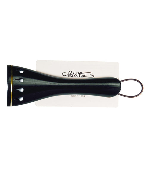 Der in einer runden Form gefertigte Geigen Saitenhalter besticht mit einem Goldreifchen.